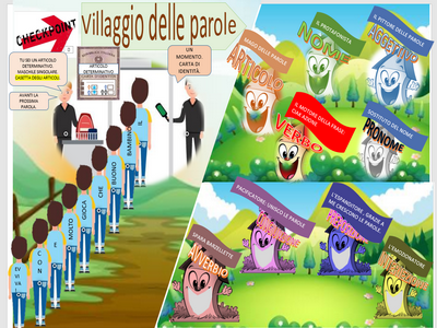 Il villaggio della grammatica: le 9 casette delle parole. Sono presentate le 9 parti del discorso in forma di racconto per meglio farle comprendere e meoriazzare | ![]() Come si esprime la lingua italia: parola (suono e seme) frase (grammatica e sintassi) | |
